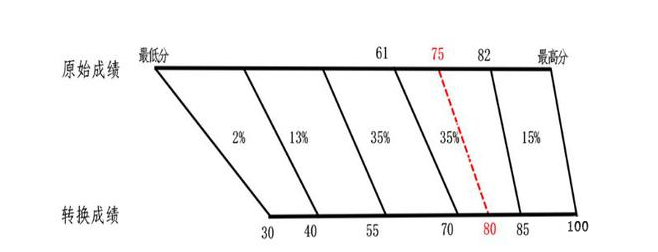 转换时将各科目考生原始成绩从高到低划分为A、B、C、D、E共5个等级,各等级人数所占比例分别约为15%、35%、35%、13%和2%。各科目成绩计入考生总成绩时,将A至E等级内的考生原始成绩,按照事先确定的比例,依照转换公式,分别转换到100~86、85~71、70~56、55~41、40~30五个分数区间,得到考生的赋分成绩。转换基数为实际参加该科目选择考的人数(不含缺考及因违纪作弊已被取消该科成绩的人数)。