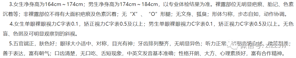 一般要求男生身高170cm以上,女生身高160cm以上。
