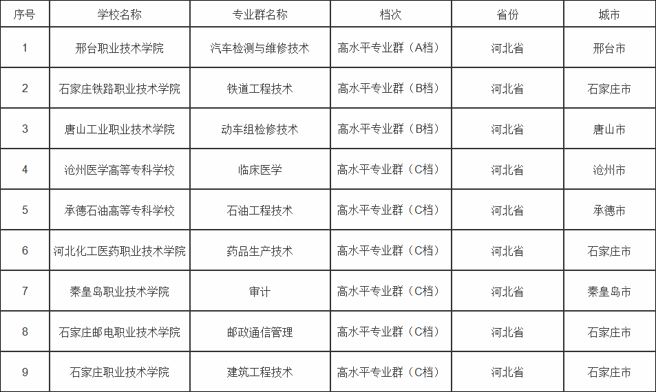 河北共有邢台职业技术学院、石家庄铁路职业技术学院等7所学校入选了高水平专业群建设单位,其中A档1所,B档2所,C档6所。
