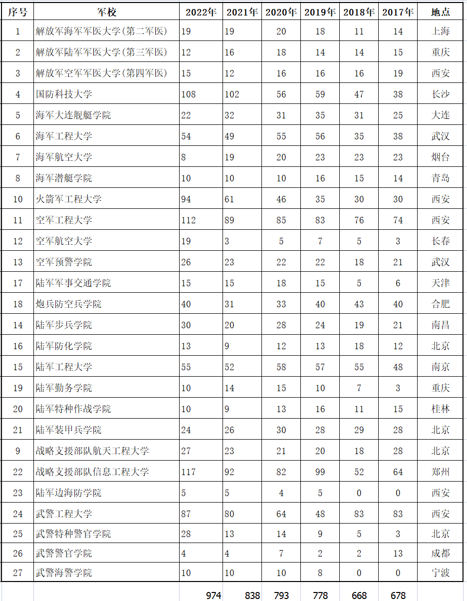 目前有27所军校在河北省进行招生,下表为各军校近几年在河北省的招生计划人数,其中2022年共招974人,物理类958人,历史类16人。